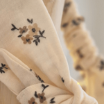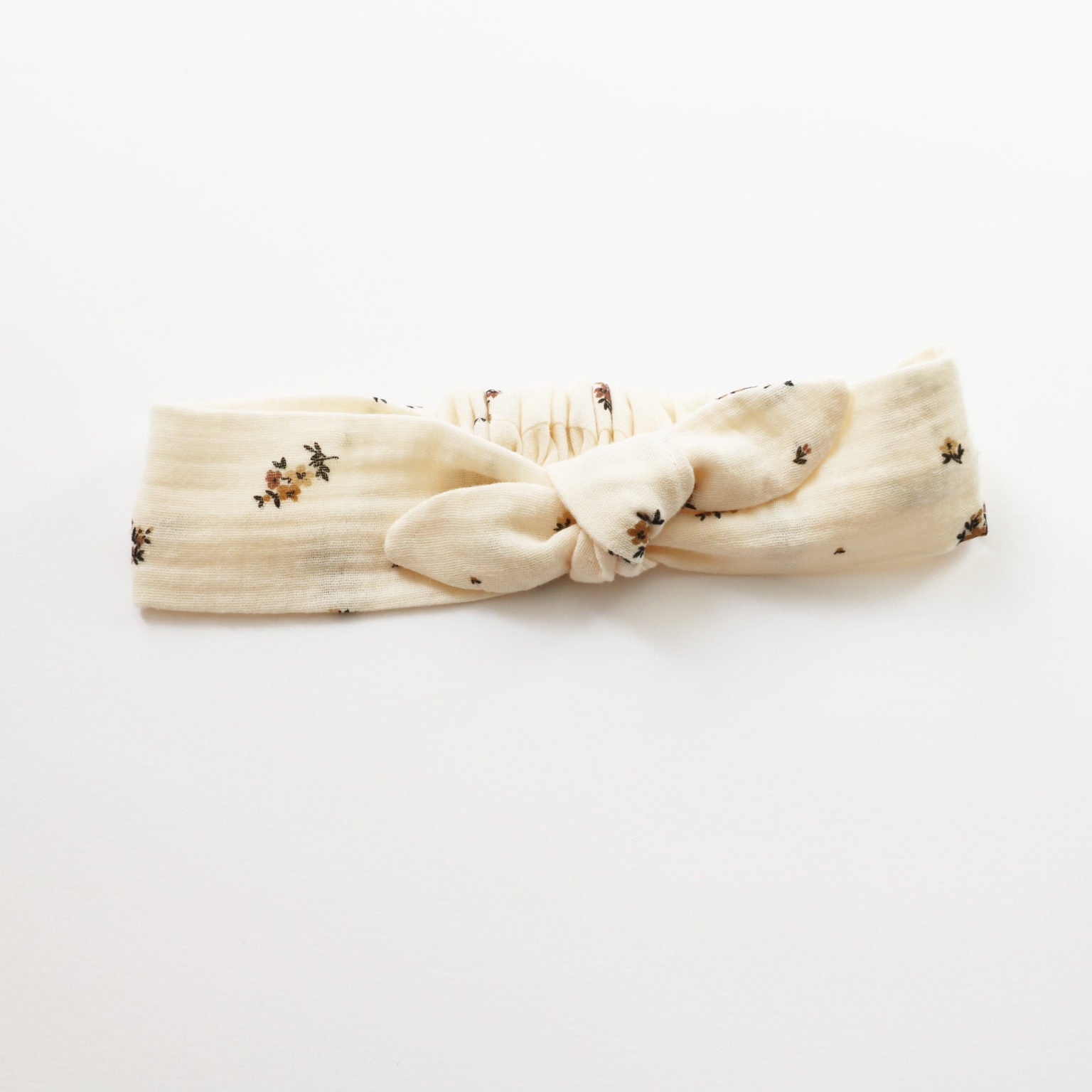 Bandeau en double gaze de coton écru à fleurs chocolat.