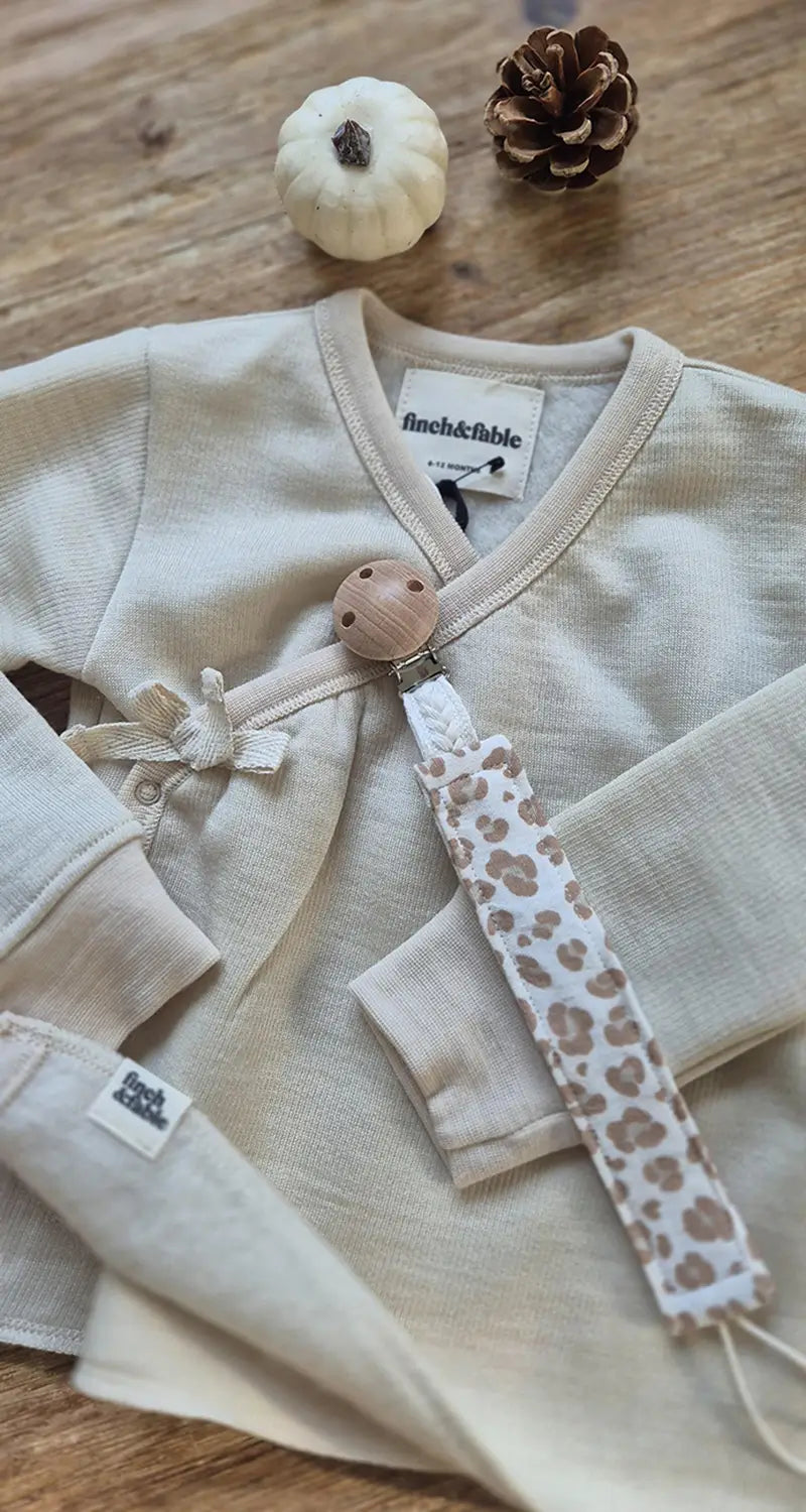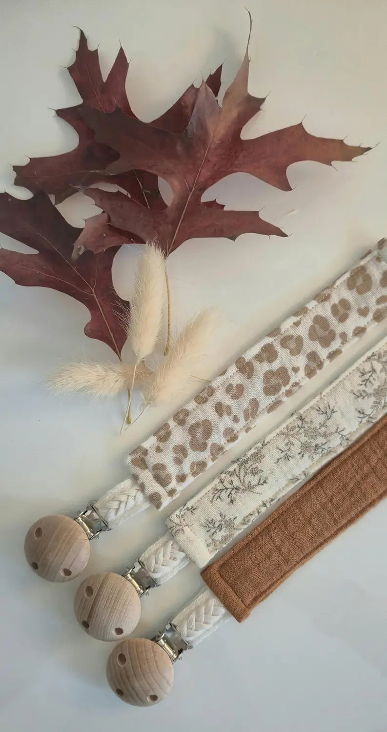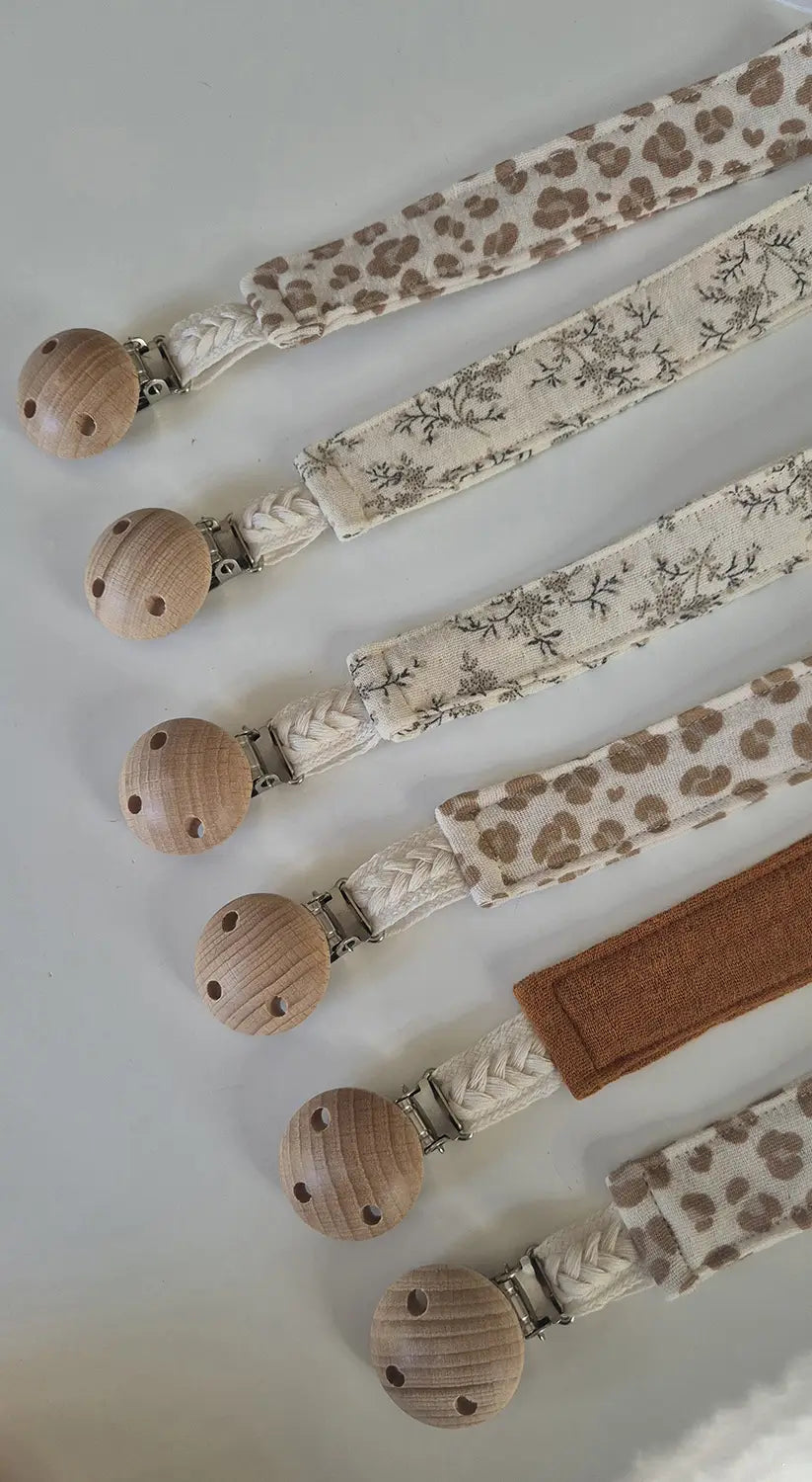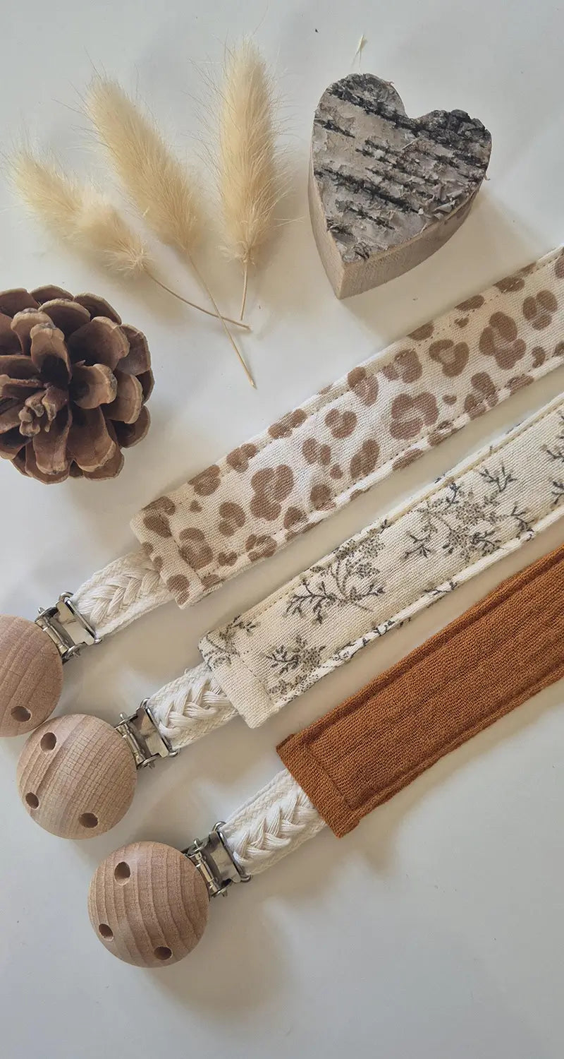 Attache-tétine en bois et double gaze de coton oeko-tex avec cordon tressé allie fonctionnalité et esthétique pour sécuriser la tétine de bébé avec style.